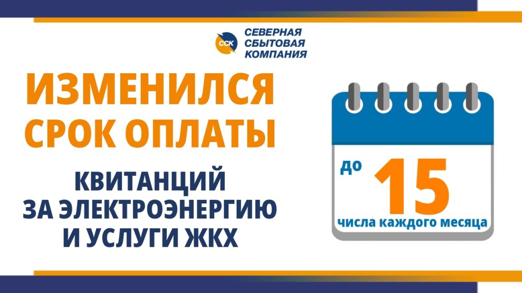 Северная сбытовая компания информирует об изменении срока оплаты счетов за электроэнергию и услуги ЖКХ.
