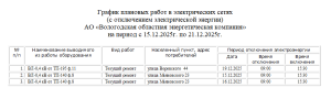 С 15.12.2025 г. по 21.12.2025 г. АО «Вологодская областная энергетическая компания» проводит плановые ремонтные работы на электросетях с отключением электроэнергии в домах.